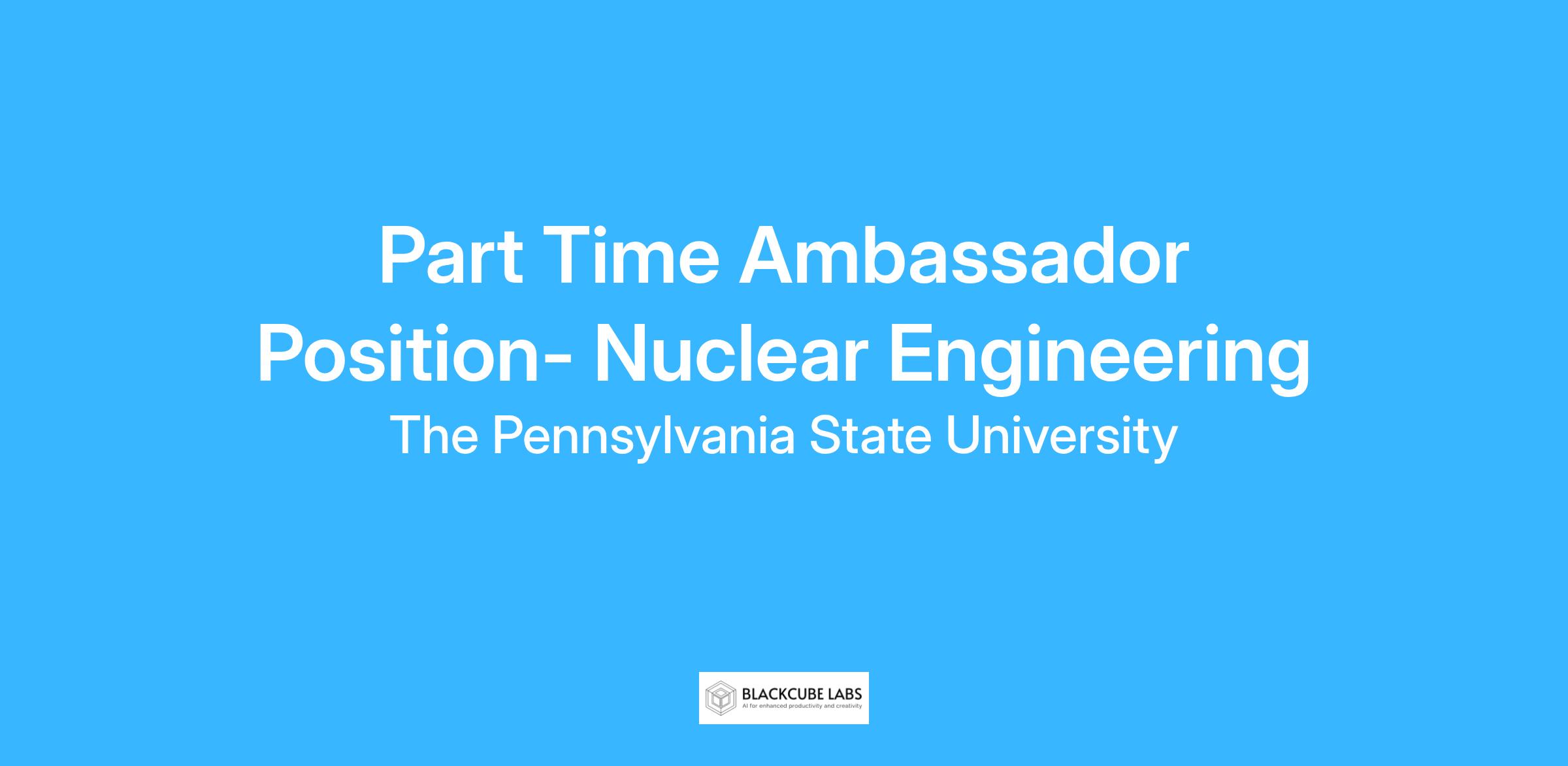 The Department of Nuclear Engineering at the Pennsylvania State University is seeking enthusiastic and responsible students to join our team as Student Ambassadors. The Ambassadors will have the opportunity to specialize in focus areas including Leadership Development, Social Media Marketing, Volunteer Management, and other areas and duties as assigned.